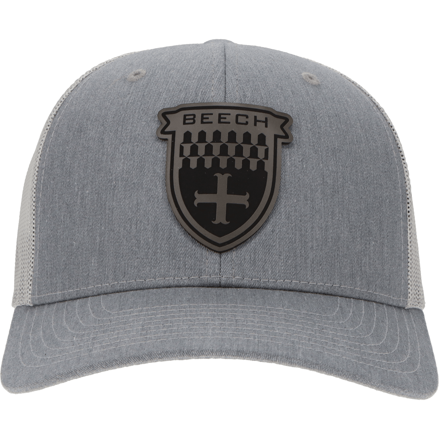 The hat features a sleek and sophisticated patch of the iconic Beechcraft Shield. The logo is crisply engraved in black on a modern, charcoal-colored leatherette, offering a sharp and understated look.